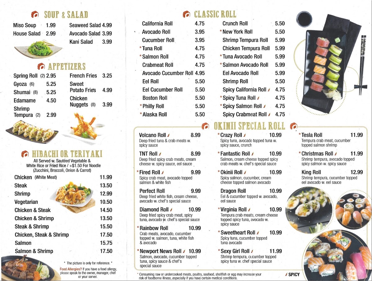 Spicy salmon & cucumber & cream cheese topped salmon & avocado W. okinii sauce . *Consuming raw or undercooked meats, poultry, seafood, shellfish or egg may increase your risk of foodborne illness, especially if you have certain medical conditions.